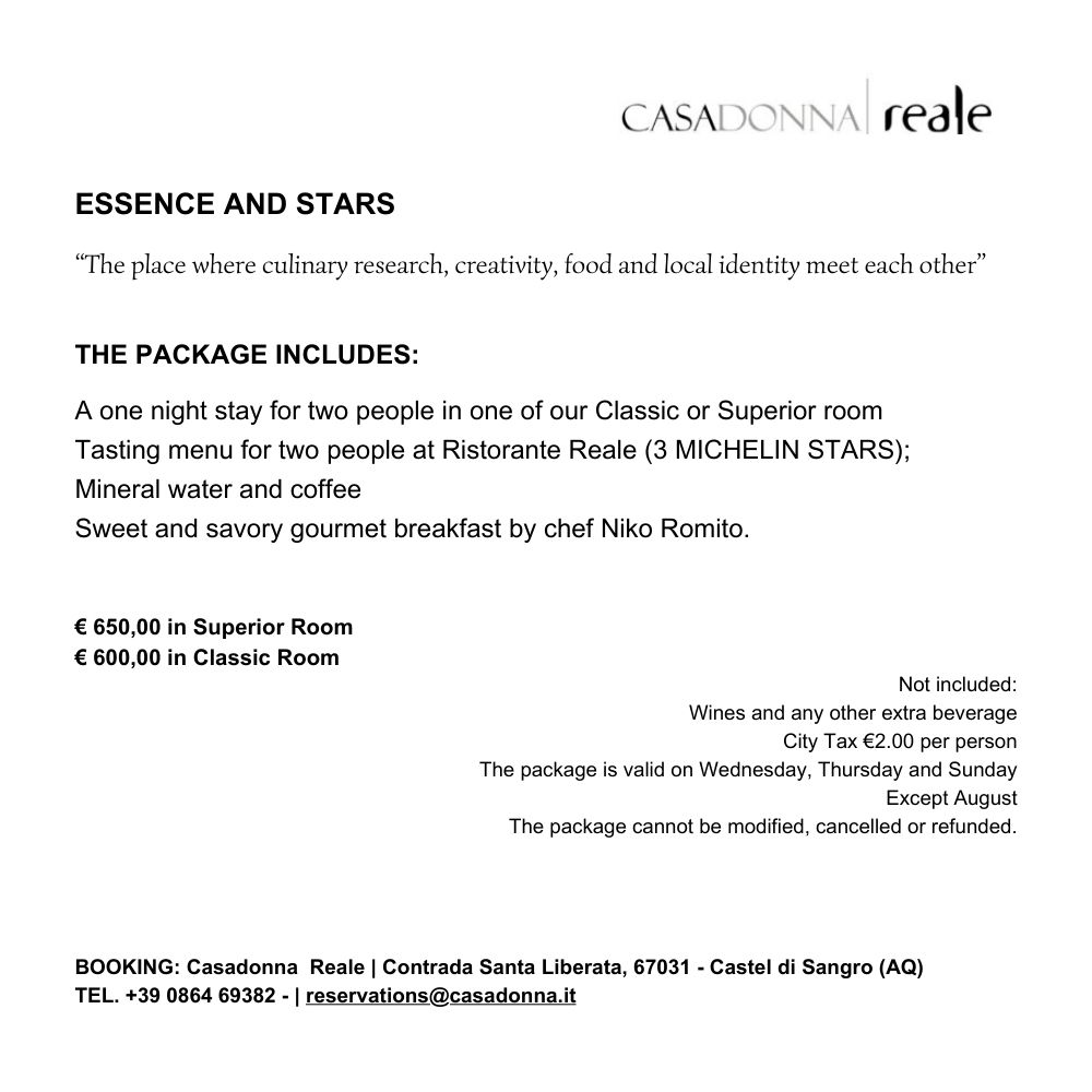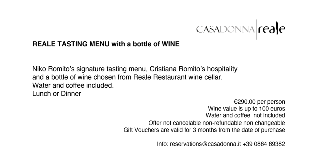 Niko Romito’s signature tasting menu, Cristiana Romito’s hospitality and a bottle of wine chosen from Reale Restaurant wine cellar.